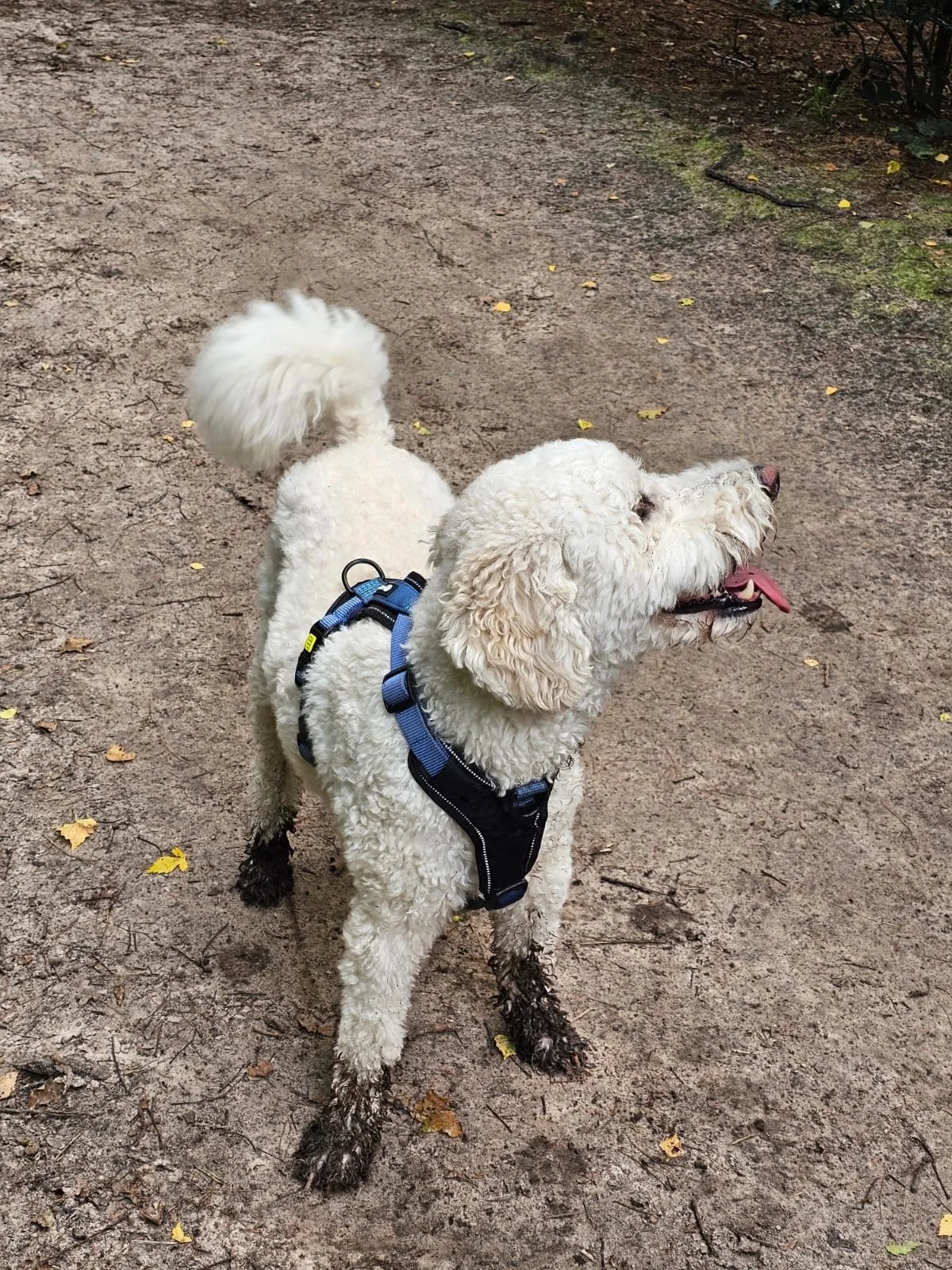 Je zou denken dat er een opbouw zit in zo’n wandeling. Dat we langzaam in de flow komen. Maar nee. Riley dook binnen vijf minuten – echt, ik was even in gesprek – met alle vier haar poten in een modderpoel waar je u tegen zegt. Ik had nog geen foto kunnen maken, of ze kwam al aangetrippeld met die trotse blik van: “Kijk, ik bén de natuur.”