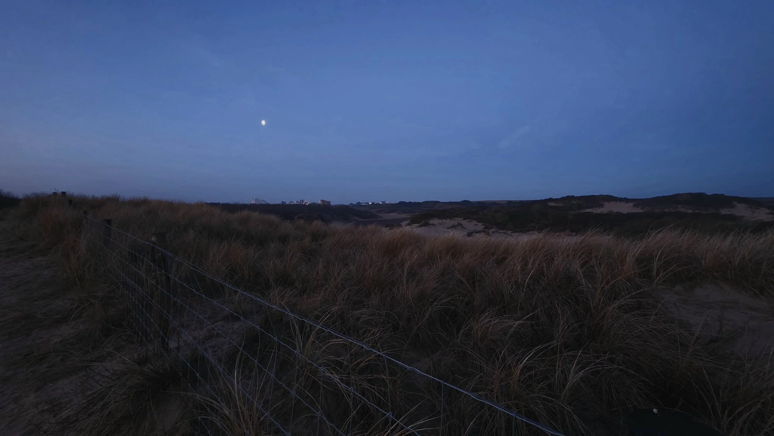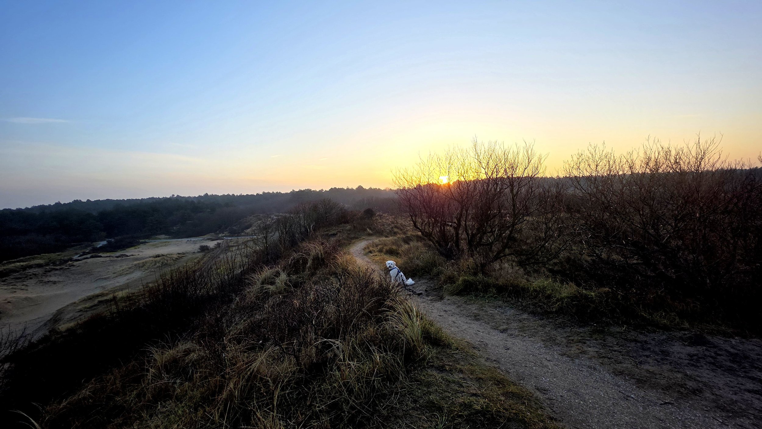 Na op vrijdag flink wat bijgeslapen te hebben, was het vannacht natuurlijk weer bagger. Ik lag maar te woelen en kon echt mijn draai niet vinden. Dus was het nog donker toen we aankwamen. Een strakblauwe lucht, de maan nog hoog en geen spoor van haast. Om half acht stapten Riley en ik uit de auto, klaar voor een zonsopgangwandeling door de duinen van Noordwijk. Zo’n start van de dag waarbij alles nog stil is, behalve jijzelf en de natuur die langzaam wakker wordt.